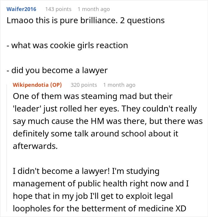 Some commenters had questions about the principal’s involvement and the degree of impartiality in his rules. “From what I know, the principal mostly got involved to keep the peace, and possibly to avoid friction with angry parents. I’d like to add, since people in the comments asked that a lot, that I didn’t take him up on his recommendation to become a lawyer. I got into public health, but I still draw, and I still make crepes!” she shared with We.