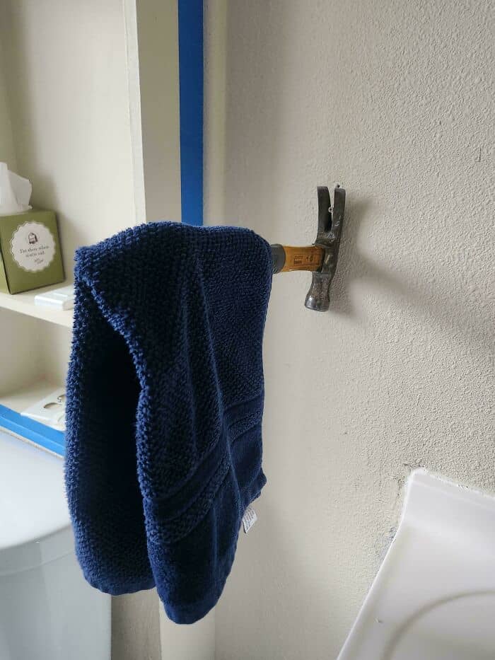 Wife is painting the bathroom so removed all hanging items, includes of the towel holder. With a redneck engineer in the house, that will not stand. A finger tight screw in a wall anchor and problem solved.