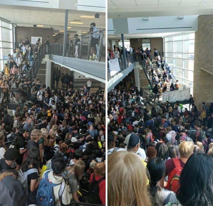 #51 My School During Passing Period. Right Picture Went Sorta Viral A Couple A Years Ago And Left One Was Taken Today. Nothing Has Changed