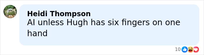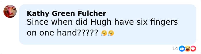 One suspicious user commented, “Since when did Hugh have six fingers on one hand?????”