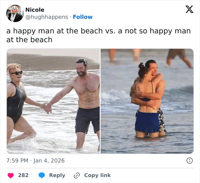 The couple’s photos also sparked a wave of comparisons with Jackman’s ex-wife, Deborra-Lee Furness, with many noting the similarities between the two beach settings
