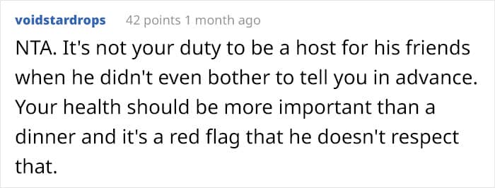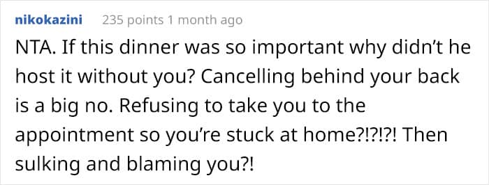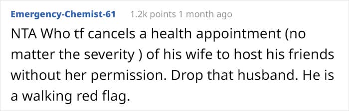 However, it seems that not everyone receives support when they need it most. A month ago, Reddit user Steady-Sailing3898 created a post on the AITA subreddit about how she finally made a doctor’s appointment to deal with her ongoing health problems. To her surprise, her husband canceled it behind her back because he needed her to host a dinner party for him and his friends.