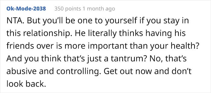 The woman’s story received quite the attention from the AITA community. The vast majority of members determined that she was not in the wrong in this situation, saying that it was inappropriate of her husband to put his ego over her health.