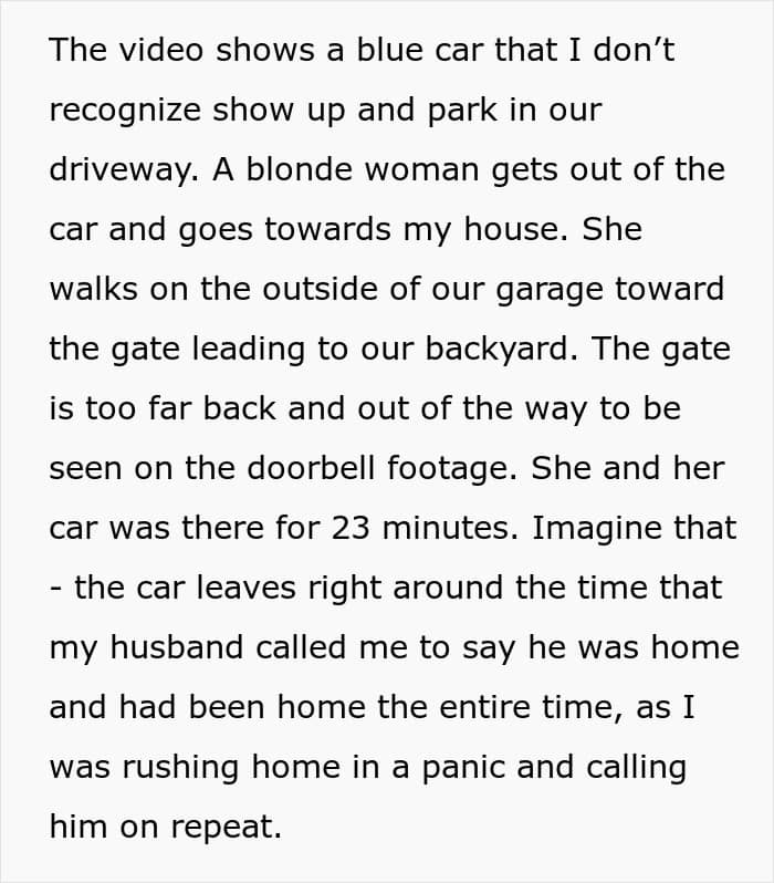 A few days later, the wife accessed the doorbell camera footage from her neighbor and saw another woman arriving at their house