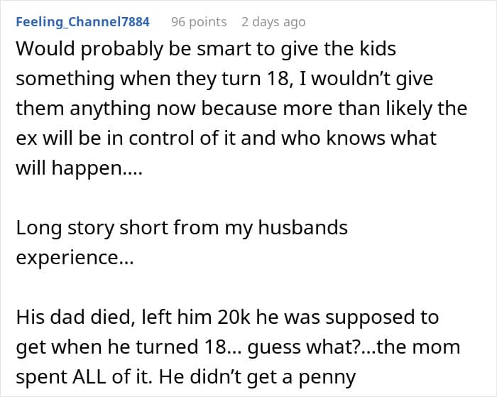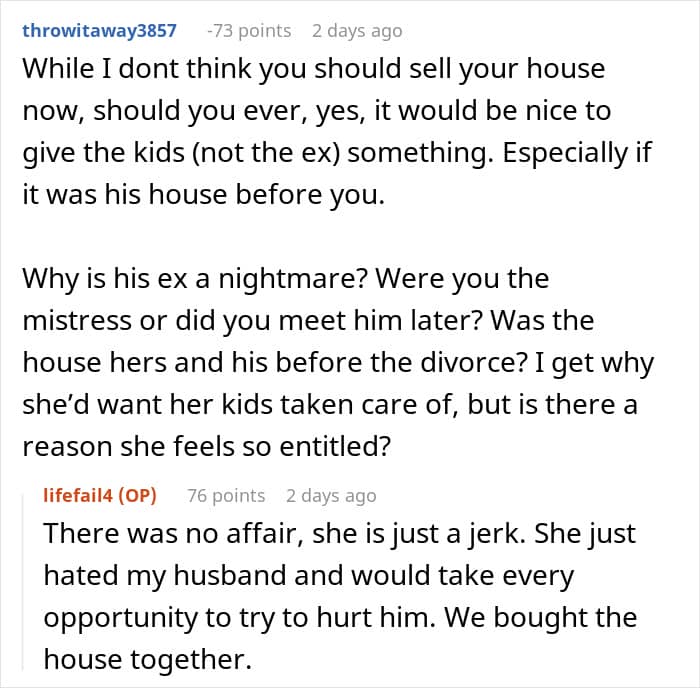 The commenters were divided into two camps. Some said the OP is acting incredibly selfish by not considering the children from her husband’s first marriage. Others claimed she owed them nothing; it was the husband’s job to ensure his children from the first marriage get taken care of.
