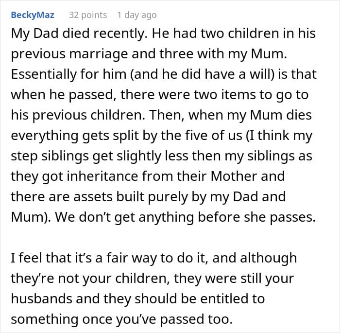 RELATED:This woman faced a dilemma about her deceased husband’s estate: to share it with her stepkids or not