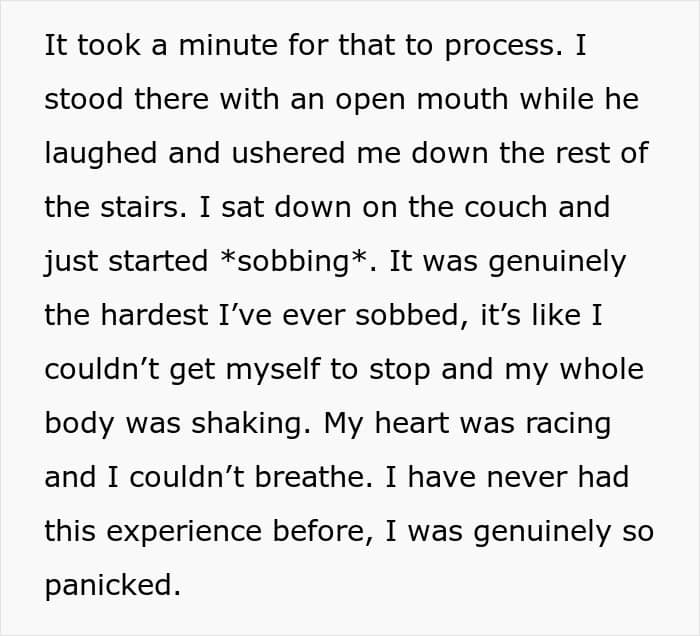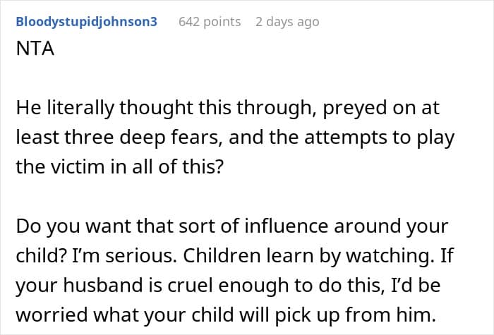 Generally, just the “threat” of a trigger can be enough to provoke anxiety. This is already a pretty major disorder, but it can “flare up” and provoke full-blown panic attacks. If you are going to spend a decent amount of time with a person, it’s best to know if there are some seemingly innocuous things that might cause them real distress. Instead this husband took a vulnerable part of this woman’s life and used to pull a prank. Incidents like this would be enough to cause a breakup in a lot of cases.