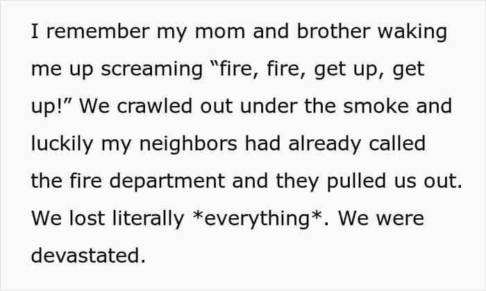 A fire is not only generally traumatic, but it literally destroys a person’s possessions. It’s quite possible that a significant part of this woman’s early life was directly influenced by this fire, and that’s before we take into account the psychological impact. In the text itself, she mentions constantly checking the oven, candles, etc. This immediately points to the fact that this trauma has not been entirely resolved yet.