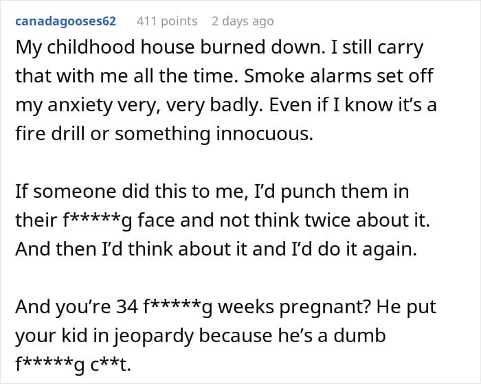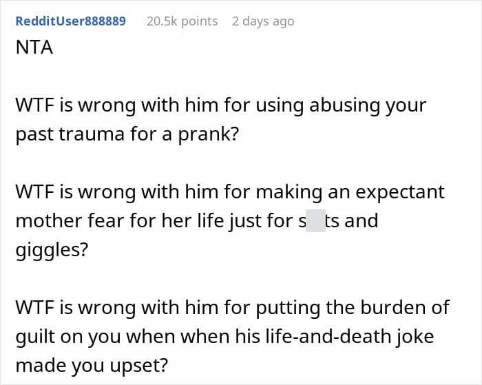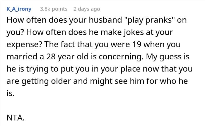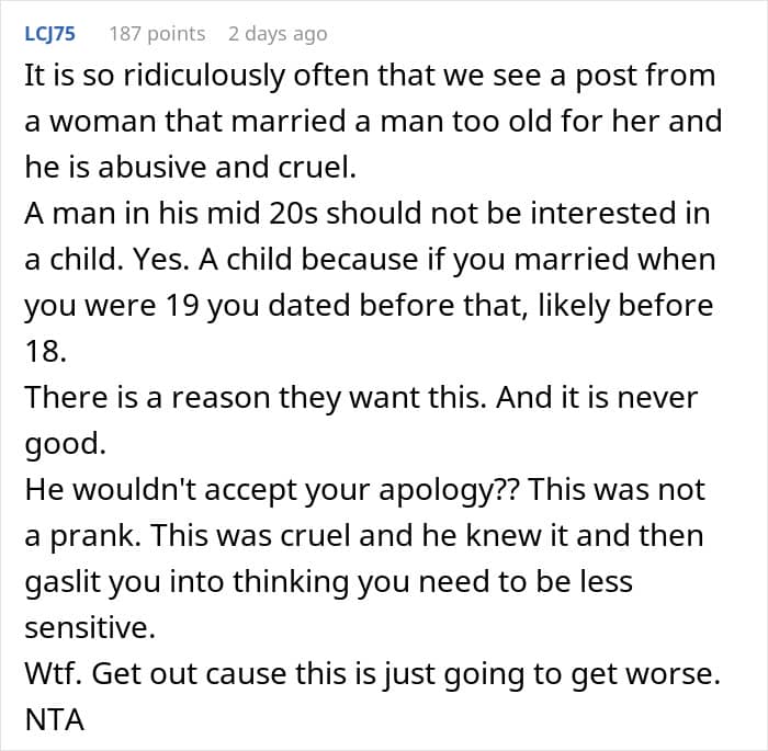 Given the wife’s experience and husband’s age (we are setting aside the age gap here) it would seem like he really should have known better. But the truly shocking part is how he reacted when she called him out. The wife had every right to be angry and he had the gall to call her “dramatic.” He claims the prank was harmless, but since he is not the “victim” of it, he has no leg to stand on and make this argument.