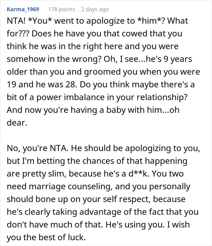 It’s quite telling that in this relationship, she then went to apologize to him, which is a shocking set of words to type given the circumstances. Even worse, as if that is possible, he then refuses to accept an apology which he does not deserve in the first place. Fortunately, the vast majority of readers not only sided with the woman but started giving her advice on what to do. Hopefully, she can take on board their advice and perhaps get out of this relationship that sounds like it’s downright terrible.