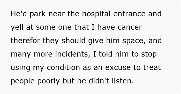 The man’s cunning behavior became even more apparent when he cut in line by telling people his wife had cancer, and how he used her diagnosis to park closer to the hospital entrance. Even when the OP told him how uncomfortable his actions were making her feel, he disregarded her and kept doing it anyway.