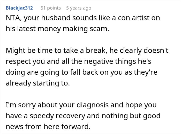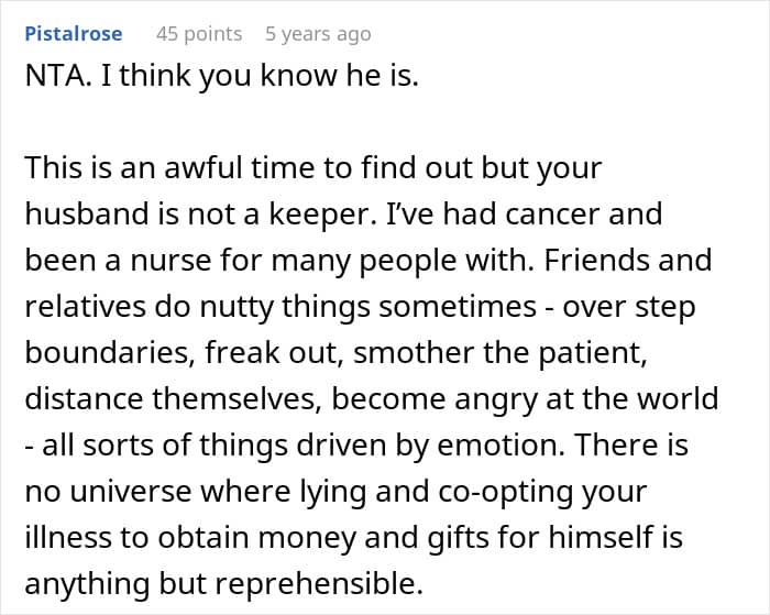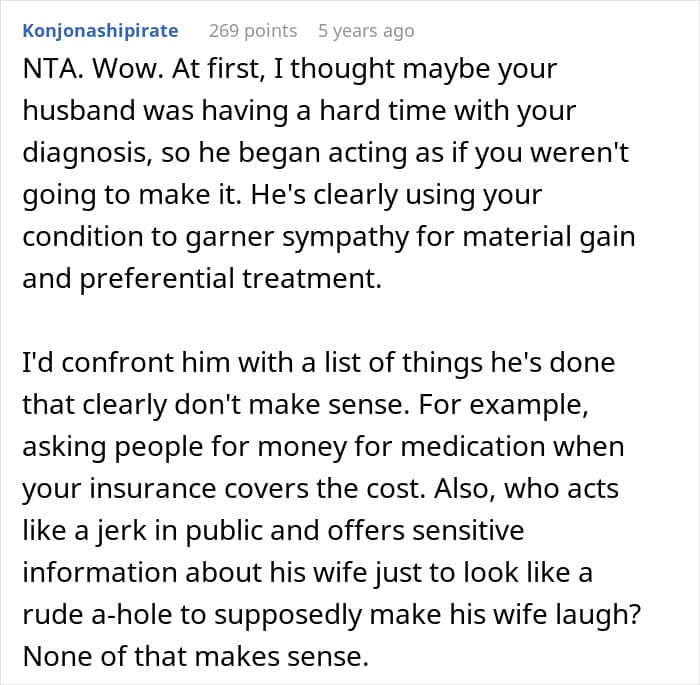 During such a difficult time, the poster definitely needed the support of her loved ones, but it seemed like her husband had other plans. Instead of looking after his wife, he started using her illness to get unnecessary gifts from people, money for medication, even though her medicines were free of cost, and self-care products that his wife couldn’t even use.