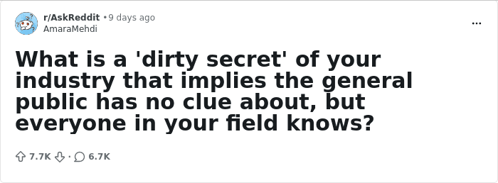 No matter which field you work in, all of them have such nasty little secrets. So, when a Reddit user askedemployeesto spill the tea about their industry, they didn’t hold back. From bizarre to shocking, we have compiled the best ones for you. Just scroll down to check them out!