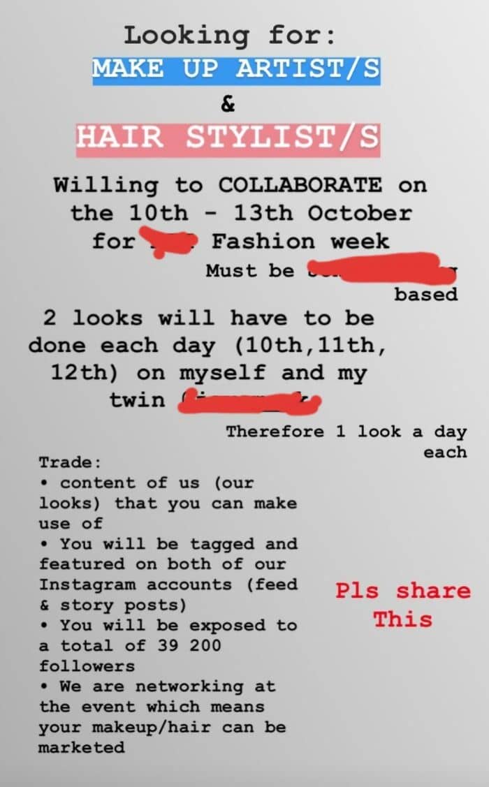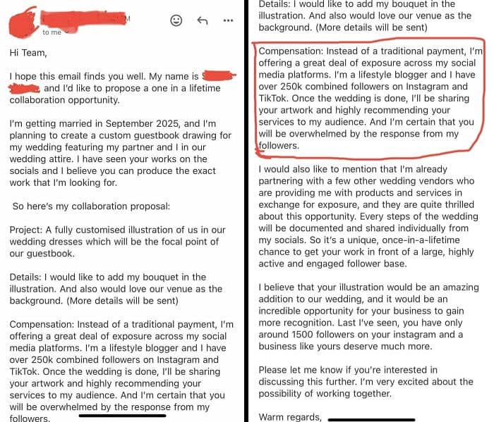 An influencer bride-to-be reached out to me, offering me a once in a lifetime opportunity to get my work in front of her 250k followers. She won’t be able to make any payments to me though