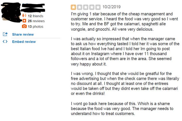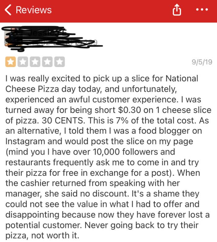 #39 Yelper Gives A Pizzeria 1 Star Because They Wouldn’t Give Her A Discount Even Though She’s An Influencer