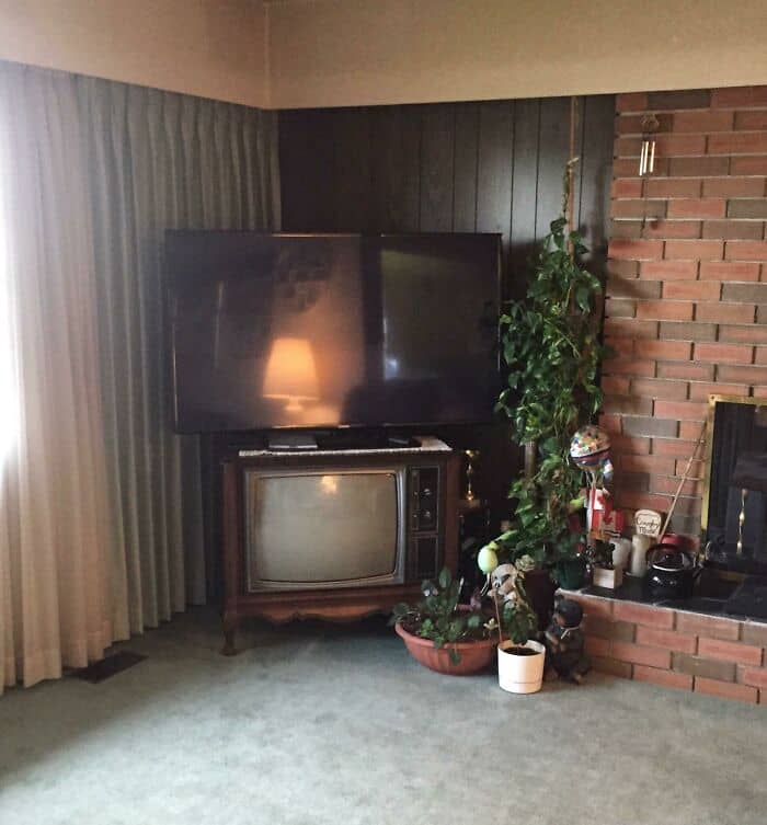 #47 My Great-Aunt Uses Her Old Television As A Stand For Her New One. Works As A Comparison Between Them Two