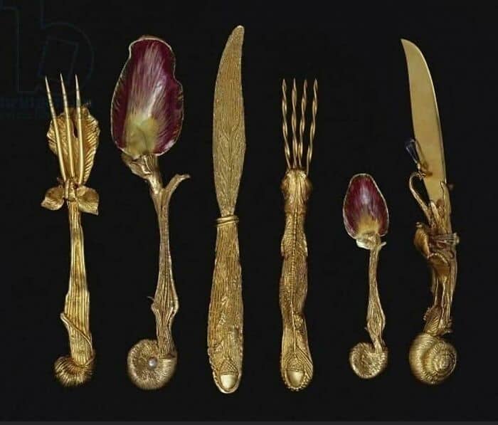 Salvador Dali cutlery set design from 1957. The set is comprised of six pieces made of silver-gilt. It includes two forks, two knives and two enameled spoons. Dali also took the time to name them as well: Fourchette-éléphant 3 dents (Elephant fork with three teeth) Cuillère-artichaut (artichoke spoon) Cocteau feuille (leaf knife) Fourchette 4 dents à manche poisson (Four tooth fork with a fish handle) Petite cuillère-artichaut (small artichoke spoon) Couteau escargot aux larmes (Snail knife with tears) The set sold for $28,125.