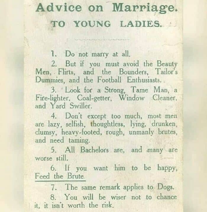 Advice on marriage written in a pamphlet by a suffragette in 1918. It is currently on display at the Pontypridd Museum in Wales, 1918