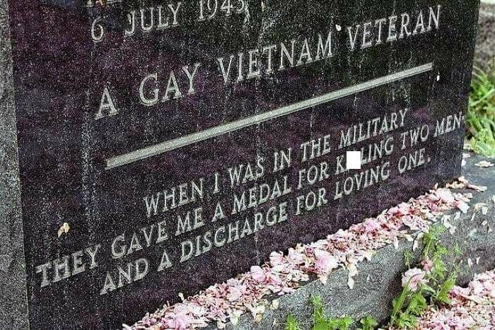 This is the grave of Leonard Matlovich. After serving three tours in Vietnam, Matlovich became a recipient of the Bronze Star and Purple Heart. On March 6, 1975, after 12 years of service, Matlovich handed a letter to his commanding officer, declaring his homosexuality. Despite his accolades and exemplary military performance, Matlovich was deemed unfit for service and was promptly discharged. He sued for reinstatement and instantly became the most famous gay activist during a time when the LGBT movement was still struggling to establish legitimacy in the United States. Below is an excerpt from Matlovich’s interview with Studs Terkel, just a few months after the discharge. “My philosophy now is that everyone in the world should be allowed to do what they want, when they want, where they want to do it, as long as what they’re doing does not violate the rights of another human being.” “What two consenting adults do in their bedroom is their business and no one else’s. And for someone to put them down or… Just that two men can touch and love and have feelings of to want and be wanted and to need and be needed and to desire and be desired and just to love and be loved, I think is very, very beautiful. And that parents growing up today will give our little children guns, and we are very proud of them when they play Cowboys and Indians and run around. But when they show emotions and, and love, and two little boys touch, people get uptight, and they’re so afraid that their child may, may love. It’s very sad.”