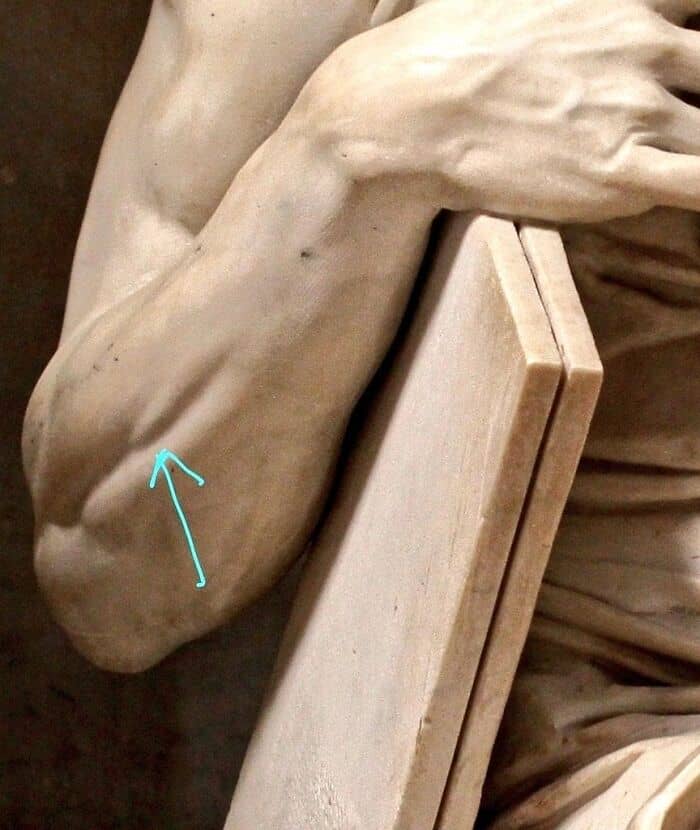 This is the right forearm of Michelangelo’s Moses (c. 1513–1515) statue. The arrow points to a small muscle called the extensor digiti minimi, which only contracts when the pinky is lifted, otherwise it is invisible. Most of Michelangelo’s sculptures are painstakingly detailed and you can clearly see his obsession with the human body, which he saw as a physical representation of the soul. Michelangelo always preferred sculpting over painting. Here’s a letter he wrote to Giovanni da Pistoia (a member of the Florentine Academy) while painting the Sistine Chapel. “I’ve already grown a goiter from this t*****e, swollen up here like a cat from Lombardy (or anywhere where the stagnant water’s p****n). My stomach’s squashed under my chin, my beard’s pointing at heaven, my brain’s crushed in a casket, my breast twists like a harpy’s. My brush, above me all the time, dribbles the paint so my face makes a fine floor for droppings! My haunches are grinding into my guts, my poor a*s strains to work as a counterweight, every gesture I make is blind and aimless. My skin hangs loose below me, my spine’s all knotted from folding over itself, I’m bent taut as a Syrian bow. And because I’m like this, my thoughts are crazy perfidious tripe: anyone shoots badly through a crooked blowpipe. My painting is dead. Defend it for me, Giovanni, protect my honor. I am not in the right place—I am not a painter.”
