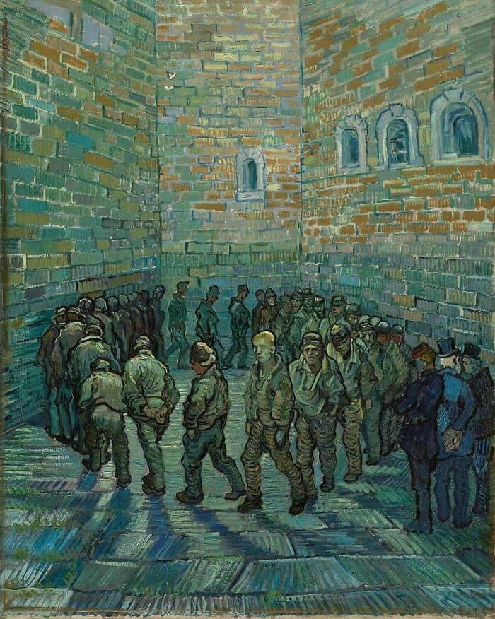 Prisoners Exercising (1890) by Vincent van Gogh. In 1888, Van Gogh, who was suffering from severe bouts of depression, cut his own ear off after getting in a fight with fellow artist Paul Gauguin. Others have stipulated that it might have been Gaugin who had cut off his ear during the scuffle, knowing that no one would believe the mad artist. A few months later after the incident, Van Gogh voluntarily committed himself to an asylum in Saint-Rémy-de-Provence. It was during this time that he wrote, “Sometimes moods of indescribable anguish, sometimes moments when the veil of time and fatality of circumstances seemed to be torn apart for an instant.” Since the asylum limited him to the outside world, Van Gogh began to paint copies of works made by other artists. One of those works was Gustave Doré’s 1872 engraving of Newgate prison yard in London. (swipe left). The painting shows a group of prisoners walking in circles around a small prison yard that is surrounded by brick walls. The prisoners walk past the guards so they would remember their faces. It has been suggested that the face of the prisoner in the center of the painting looking outward is Van Gogh himself. In the last two years of his life, Van Gogh averaged approximately three paintings a week. In total, he produced 900 paintings during a 10 year career, making him one of the most prolific artists to have ever lived.