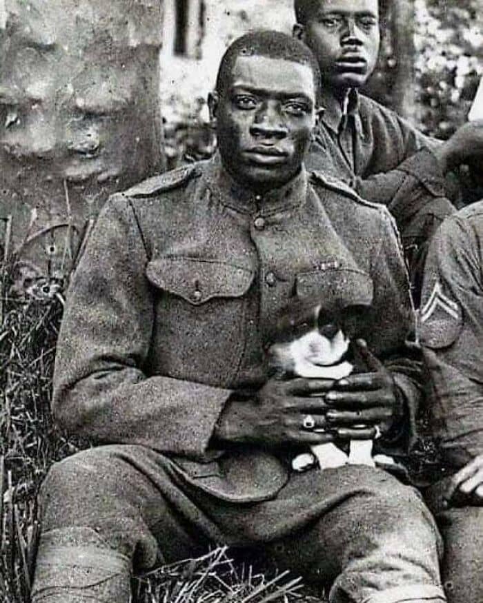 A member of the Harlem Hellfighters (369th Infantry Regiment) poses for the camera while holding a puppy he saved during World War 1, 1918. The Harlem Hellfighters was a regiment made up of decorated Black soldiers who fought as part of the French army because the U.S. did not allow Black soldiers to fight alongside white soldiers. The French accepted the Harlem Hellfighters with open arms and did not racially segregate them. During World War 1, they fought on the front lines for 191 days, longer than any other American unit. And as a result, suffered the most casualties of any American regiment—losing approximately 1,500 men. Despite the heavy death toll and the poor replacement system, the Harlem Hellfighters never lost a trench or a foot of ground to the enemy; none of them became prisoners of war. Not only were they one of the most successful regiments of World War 1, but they also helped bring Jazz to France. Upon returning home, the Harlem Hellfighters received a welcome parade in New York City; a privilege that was denied to them before they had left for war. However, the celebrations were short lived as the summer of 1919 became known as the Red Summer, in which the country saw some of the worst racial violence since the Civil War. The Harlem Hellfighters who dreamed of returning home to a place that would finally treat them with respect and as equal human beings, quickly realized that nothing had changed at all.