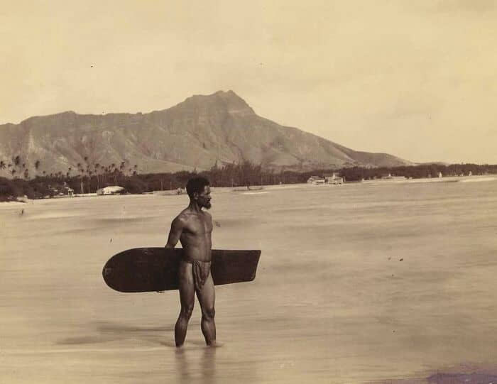 One of the earliest photos of a surfer at Waikiki Beach, carrying an alaia board in 1898. While reading about the history of surfing, I came across this passage in a travelogue called “Roughing It” by Mark Twain, which was published in 1872. Apparently Twain was one of the earliest writers to have witnessed surfing in the Hawaiian Kingdom. He writes: “In one place we came upon a large company of naked natives, of both sexes and all ages, amusing themselves with the national pastime of surf-bathing. Each h*****n would paddle three or four hundred yards out to sea (taking a short board with him), then face the shore and wait for a particularly prodigious billow to come along; at the right moment he would fling his board upon its foamy crest and himself upon the board, and here he would come whizzing by like a bombshell! It did not seem that a lightning express-train could shoot along at a more hair-lifting speed. I tried surf-bathing once, subsequently, but made a failure of it. I got the board placed right, and at the right moment, too; but missed the connection myself. The board struck the shore in three-quarters of a second, without any cargo, and I struck the bottom about the same time, with a couple of barrels of water in me. None but natives ever master the art of surf-bathing thoroughly.”