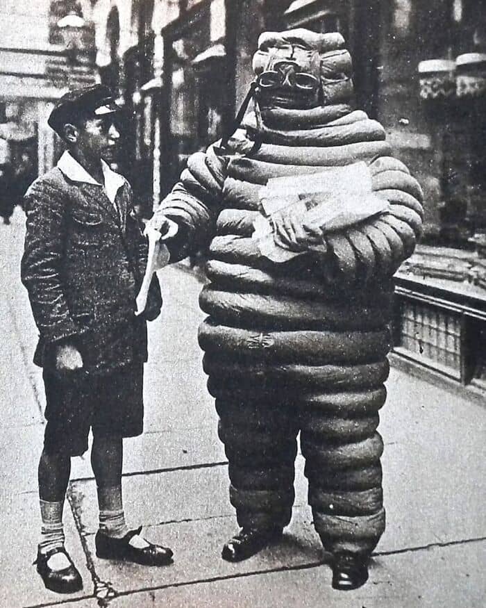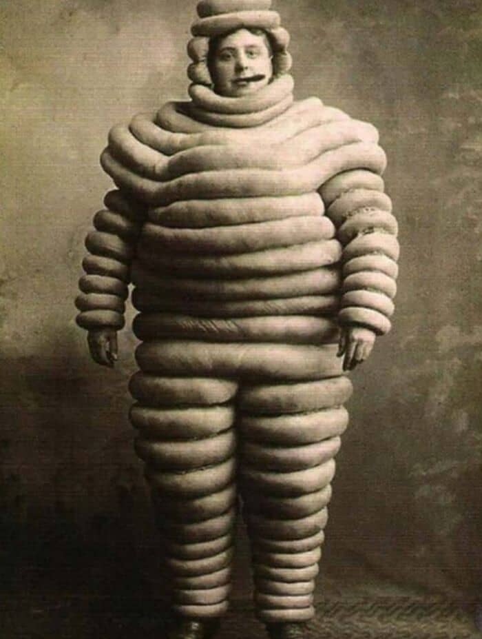 The original Michelin Man from 1898. The Michelin Man is white because rubber tires are naturally white. It was not until 1912, that carbon chemicals were mixed into the white tires, which turned them black. The change was structural, not aesthetic. By adding carbon, tires became more durable. Michelin also began reviewing restaurants so that more people would travel further distances in their cars to eat at these restaurants. This in turn would wear down their tires faster, and force them to buy more. The Michelin star system goes up to three and is broken down by whether or not it’s worth driving to the restaurant. One star: “A very good restaurant in its category” (Une très bonne table dans sa catégorie) Two star: “Excellent cooking, worth a detour” (Table excellente, mérite un détour) Three star: “Exceptional cuisine, worth a special journey” (Une des meilleures tables, vaut le voyage). The Michelin Man also has a name—Bibendum. It’s a weird name considering the latin phrase, “Nunc est bibendum,” which means, “Now is the time to drink.” The phrase appears in the first line of a poem (written by the Roman poet Horace) celebrating the death of Cleopatra, Queen of Egypt, in 30 B.C.