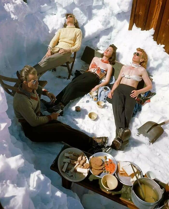 Four skiers sunbathe in the snow in Sun Valley, Idaho, 1946. Next to them is a spread of sliced white bread, olives, lox and some sort of soup. Photo by George Silk. My initial thought of the photo was that it looked very European and I was very surprised that this was in Idaho. I did a little bit of digging and discovered that Sun Valley has quite the history. Ernest Hemingway finished his book, “For Whom the Bell Tolls” while staying at the resort in 1939. Celebrities like Clark Gable, Gary Cooper, Errol Flynn, Lucille Ball, Marilyn Monroe, and several members of the Kennedy family were all frequent visitors. During World War 2, the Sun Valley resort was closed in 1942 and was used as a hospital for the U.S. Navy. The resort was reopened to the public in December, 1946, which was when this photo was taken.