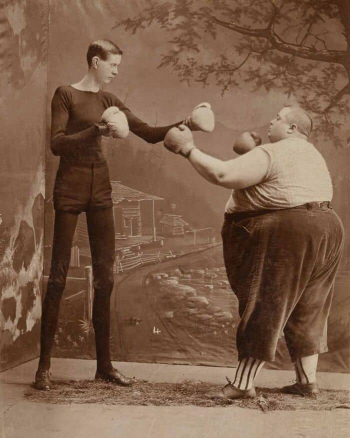 This is George Moore aka the living skeleton and Fred Howe aka the fatman who were sideshow perfomers from the late 19th century. Here is an excerpt about them in Strand Magazine from 1897: “…Fred Howe’s father was a carpenter at Alleghany City, Penn., and Fred started to learn the same trade, but soon became too fat. At the age of eighteen he joined the Forepaugh Circus as a ‘fat boy,’ and there met his present sparring partner. George Moore was born in Helena, Montana, where his father had a little dry goods shop. Until he was twenty-one years of age George worked in his father’s shop. But his greatest desire was to see the world. When the first big circus came to Helena, the manager offered him an engagement to exhibit himself as the ‘living skeleton,’ and he closed with the offer at once. Fred Howe, they soon became great friends. The doctors advised both to take as much exercise as possible—the one to gain flesh, and the other to get rid of it. These smart Yankee lads then resolved to combine duty with pleasure, so they went in for boxing. For a long time they practised privately. One day, however, the manager was told of the fun by some of his ‘freaks,’ who had been allowed to see a ‘set-to’ between the two gladiators. The manager then arranged a round or two, and the moment he saw Howe and Moore face each other, he offered them a long engagement at an increased salary, if only they would do their boxing before the public. To-day these funny fellows are not only expert boxers, but also perfect comedians in their ‘art.’ Their boxing is uproariously funny. Moore is 6ft. 3in. (190.5 cm) in height, and weighs but 97lb. (43.9 kg), whilst Howe is only 4ft. 2in. (127 cm) high, and weighs exactly 422lb. (191 kg)”