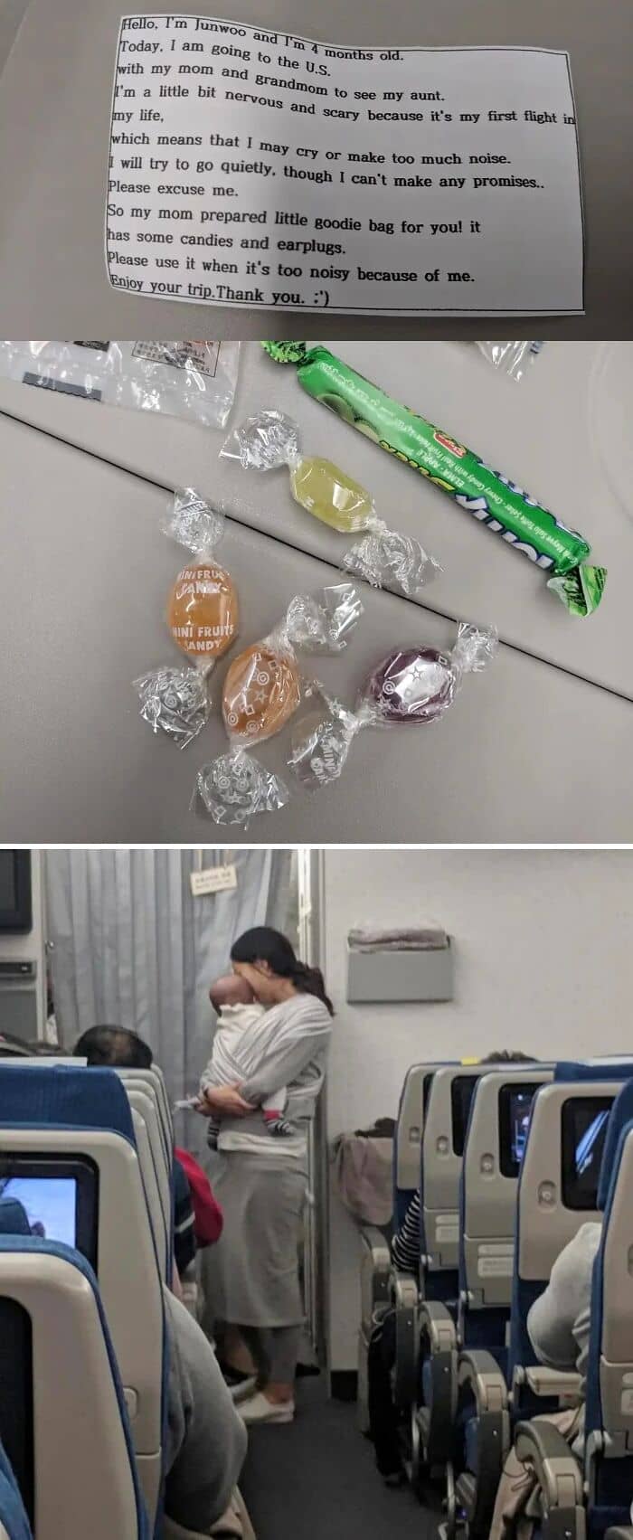 On a long 10-hour flight from Seoul to San Francisco, a mother traveling with her 4-month-old handed out over 200 little goodie bags filled with candy, earplugs, and a note that said “I may cry, thank you for your patience.” She said the bags were her way of acknowledging how unpredictable travel can be with a baby, and of showing solidarity with the fellow passengers who might be disrupted.