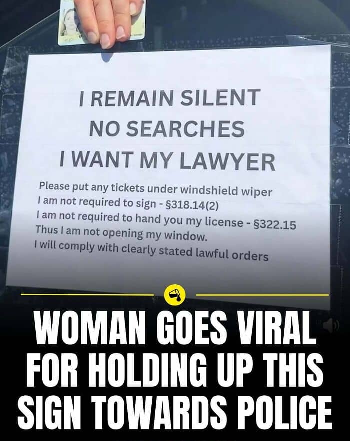 She went viral after holding a sign that read O remain silent no searches I want my lawyer. Her message highlights two of the most fundamental rights in the United States. The right to remain silent, protected by the Fifth Amendment, and the right to ask for an attorney during any police interaction. The sign quickly sparked conversation online about how people can assert their rights clearly and confidently when dealing with law enforcement.