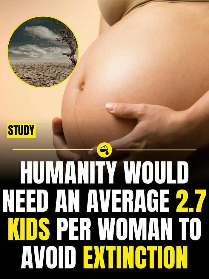 Because of chance, mortality, and population fluctuations, scientists argue humanity would actually need 2.7 children per woman to avoid eventual extinction.