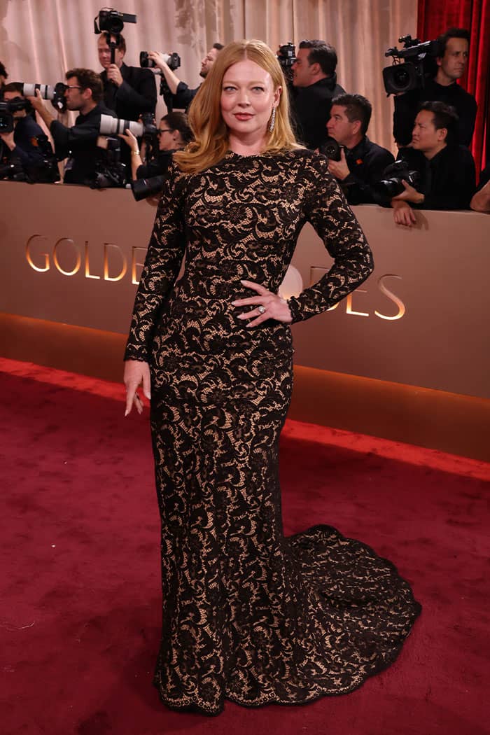 The Succession star arrived at the Beverly Hilton in a long-sleeved, form-fitting black lace gown.