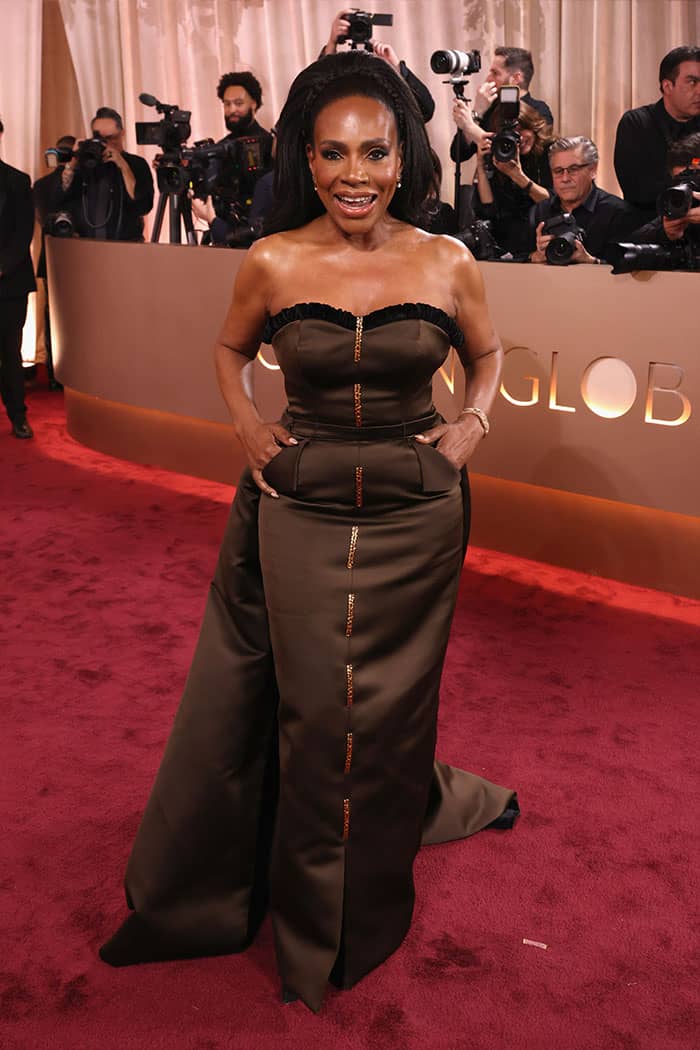 The Abbott Elementary star showed up at the awards night wearing a gorgeous chocolate brown silk gown. The strapless design featured a ruffled back velvet trim and vertical gold safety-pin embellishments.