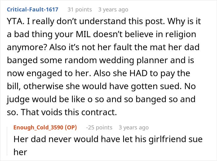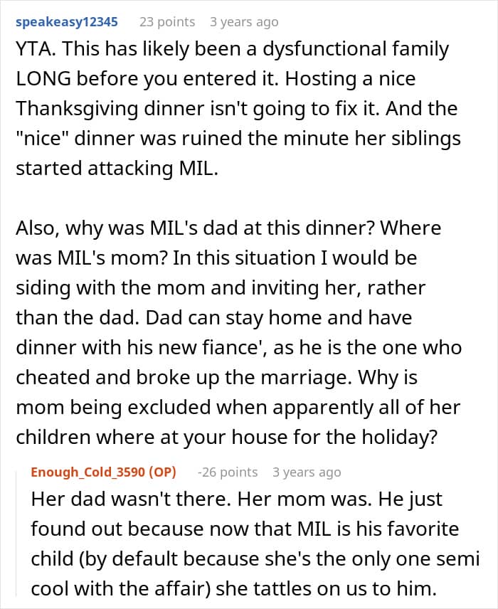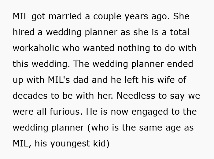 The poor lady stormed out in tears, but then accused the DIL of cowardice and pandering to her entitled fam. Interestingly, the mother-in-law’s dad later told the author roughly the same thing, so the woman even decided to take this online, seeking support.