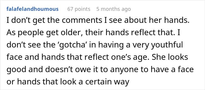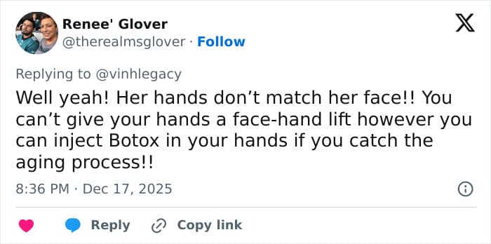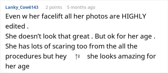 One user complimented her facelift results. “If the pic is not filtered she clearly had a good plastic surgeon. It looks quite natural compared to most others.”