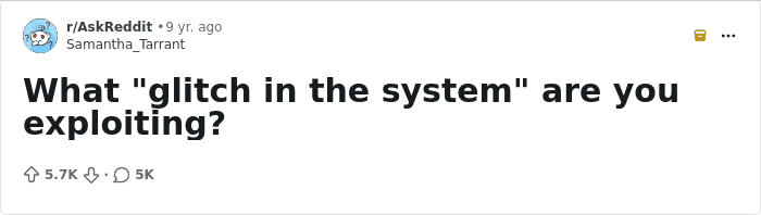 Someone recently asked, “What glitch in the system are you exploiting?” and thousands of responses came flying in. People shared all the ways they’re winning at life without breaking any rules whatsoever. Epic stories about spotting a crack, slipping through and scoring. Harmless rebellion. Big wins. Legendary bragging rights.
