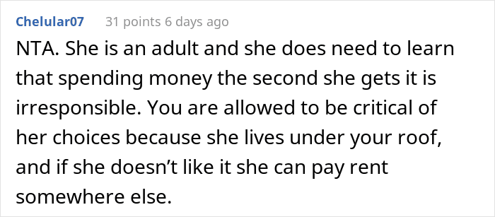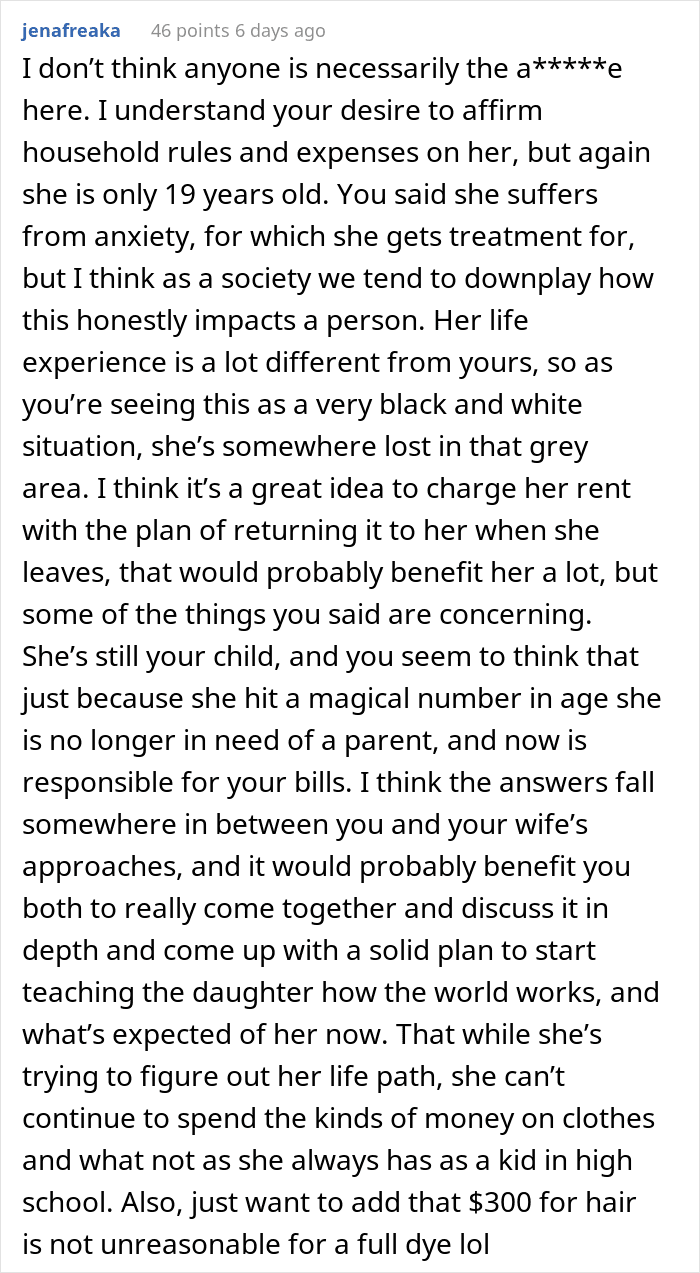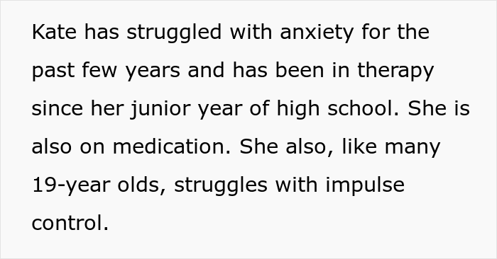 This story from a family with three kids gives us a glimpse into such a household. “Our 19-year-old, Kate, graduated from high school last year but is still living at home,” the parent wrote in a post on r/AITA. “Kate has struggled with anxiety for the past few years and has been in therapy since her junior year of high school. She is also on medication. She also, like many 19-year-olds, struggles with impulse control.”