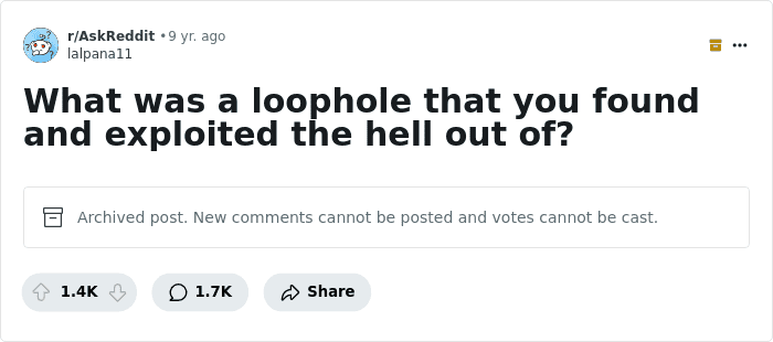 Someone asked “What was a loophole that you found and exploited the hell out of?” and people shared their best examples. So get comfortable as you scroll through, upvote your favorites and be sure to add your own thoughts and examples in the comments below.