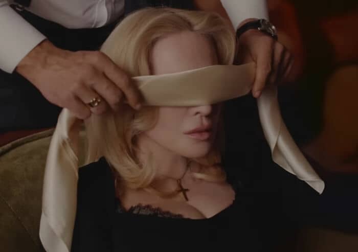 The trio then moved into a dimly lit bedroom for an intimate scene involving blindfolds, suspenders, and the singer in lacy lingerie.