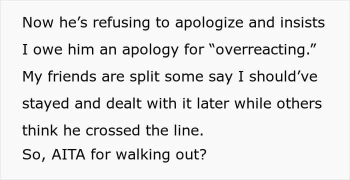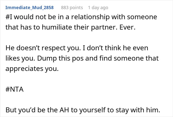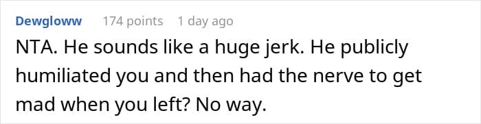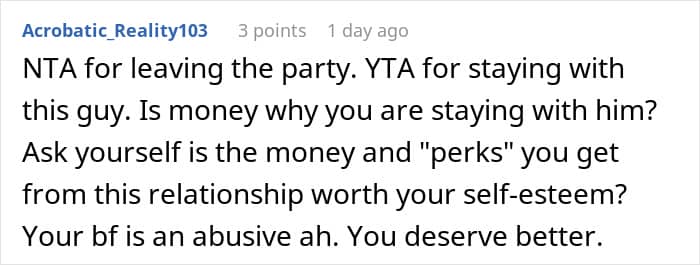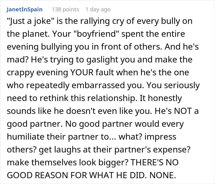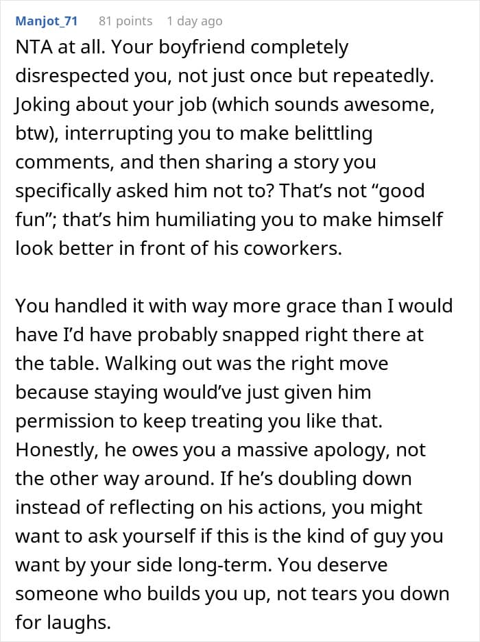 But this Redditor’s experience went beyond anything she could have imagined. Attending as her boyfriend’s plus one, she expected a fun evening of mingling—not a series of tasteless jokes at her expense. As the night went on, her boyfriend’s comments became increasingly hurtful, and after one too many, she decided to walk out.