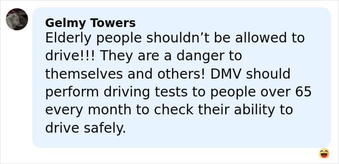 One person wrote, “Elderly people shouldn’t be allowed to drive!!! They are a danger to themselves and others! DMV should perform driving tests to people over 65 every month to check their ability to drive safely.”