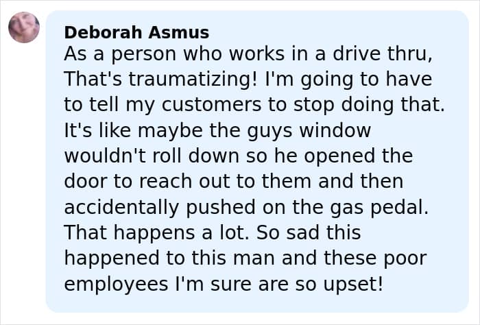 “We’re not sure if the vehicle lurched forward or what happened, but he got pinched between the door frame and the drive thru window counter.”