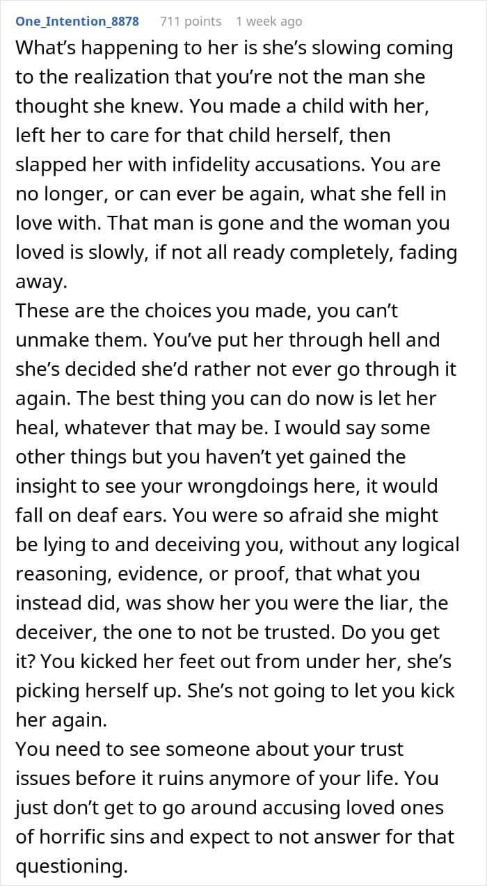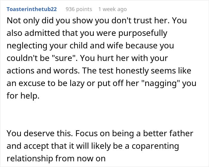 Many people in the comments are also almost sure that after what happened, there is no future for this relationship, and that all that remains for the OP here is to try to become a decent dad, at least. “You deserve this. Focus on being a better father and accept that it will likely be a coparenting relationship from now on,” someone wrote. And what do you, our dear readers, think here?