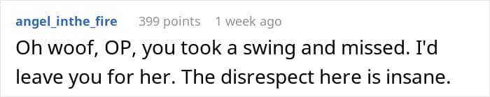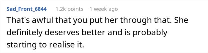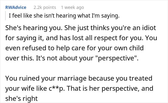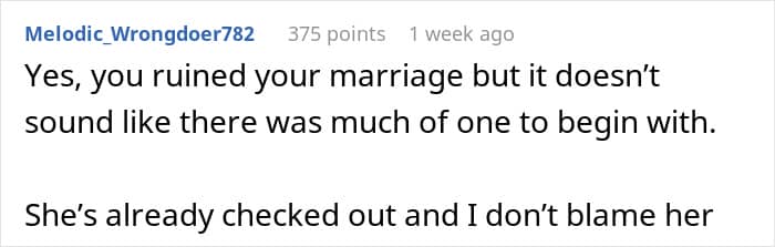 Commenters under the original post do not particularly mince words when characterizing the author. “That’s awful that you put her thorough that,” one of the people wrote angrily in the comments. “She definitely deserves better and is probably starting to realize it.” “You ruined your marriage because you treated your wife [badly]. That is her perspective, and she’s right,” another commenter added.