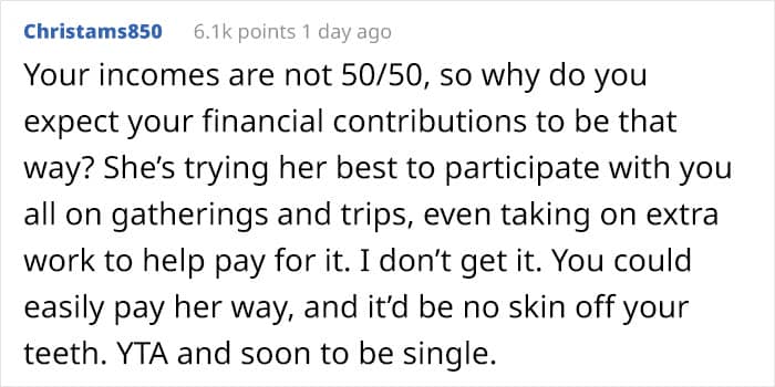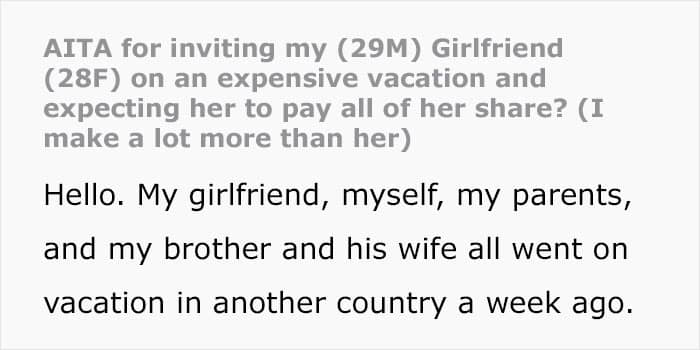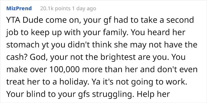 Case in point, a very well-off redditor, who has since deleted their account after the massive backlash he received, shared a tale about how he and his girlfriend went on an expensive vacation abroad with his family. The thing to keep in mind is that the guy earns more than three times what his partner does and comes from a very well-off family. Meanwhile, his girlfriend had to get a second job for several months to even afford to go on the expensive vacation. And even then she couldn’t afford to go on all the outings or to even eat three square meals a day.