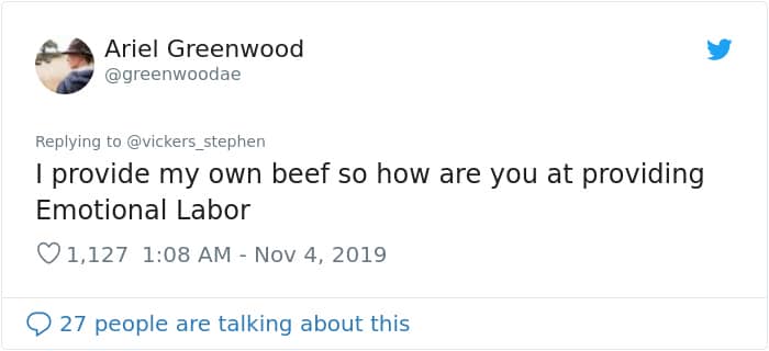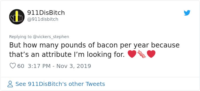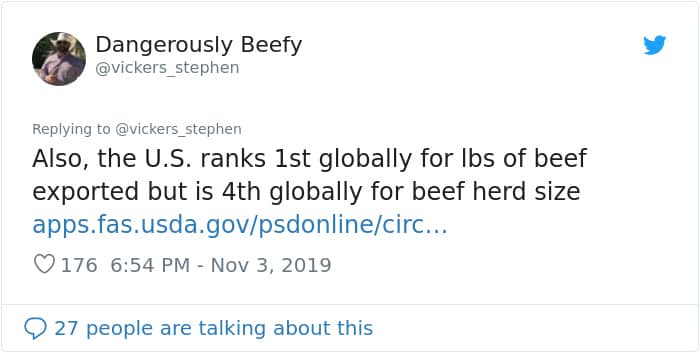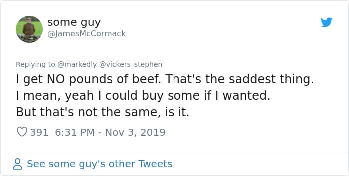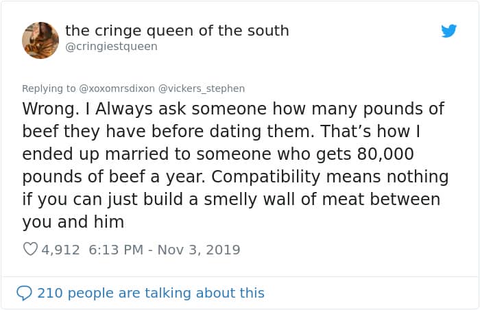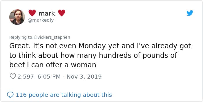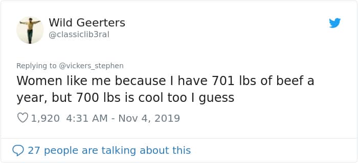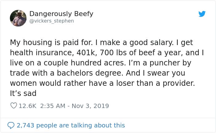 Sadly for the likes of Twitter user Stephen Vickers, the modern woman just doesn’t value basic qualities like physical protection and being ‘provided for’ the way that she used to– not even 700lbs of beef annually can replace a decent personality these days. What is the world coming to?