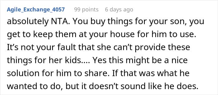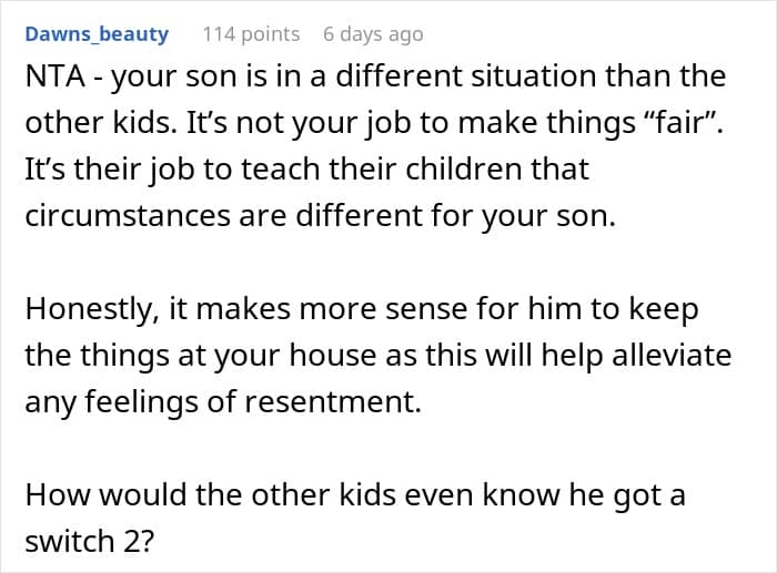 The situation reached a boiling point over the purchase of a Switch 2. The father bought the console for his ten-year-old son, but the ex-wife demanded it be brought to her house so her other four children could use it for family gaming. This highlights a massive issue regarding property and autonomy. When a parent buys an expensive gift, they have every right to decide where that gift stays, especially if there is a history of items being broken or lost at the other house. Keeping high-value items at one location isn’t about being petty, it’s about asset management and ensuring the child actually gets to enjoy their gift without it becoming a source of conflict or a casualty of a chaotic household.