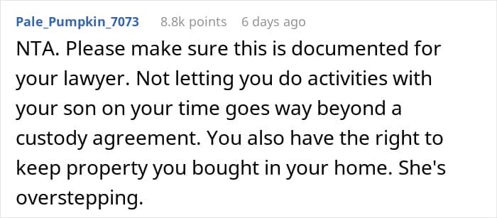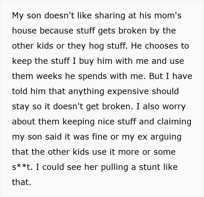 A dad turned to the internet for advice after getting into a dispute with his ex-wife. Her new family included three kids from the other man and she insisted that her ex-husband treat them the way he treats their shared son. So when he refused to let him take the gaming console he brought him to her house, drama ensued.